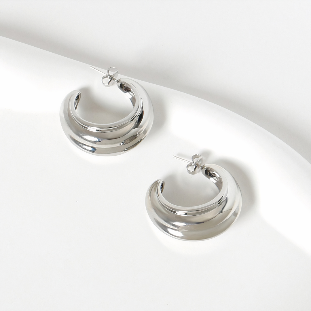 Dessa statement örhängen är tillverkade av förstklassigt 925 sterling silver och finns tillgängliga i både elegant silver och med lyxig 18k guldplätering. Med en generös storlek på 31 mm är de en perfekt balans mellan stil och djärvhet.